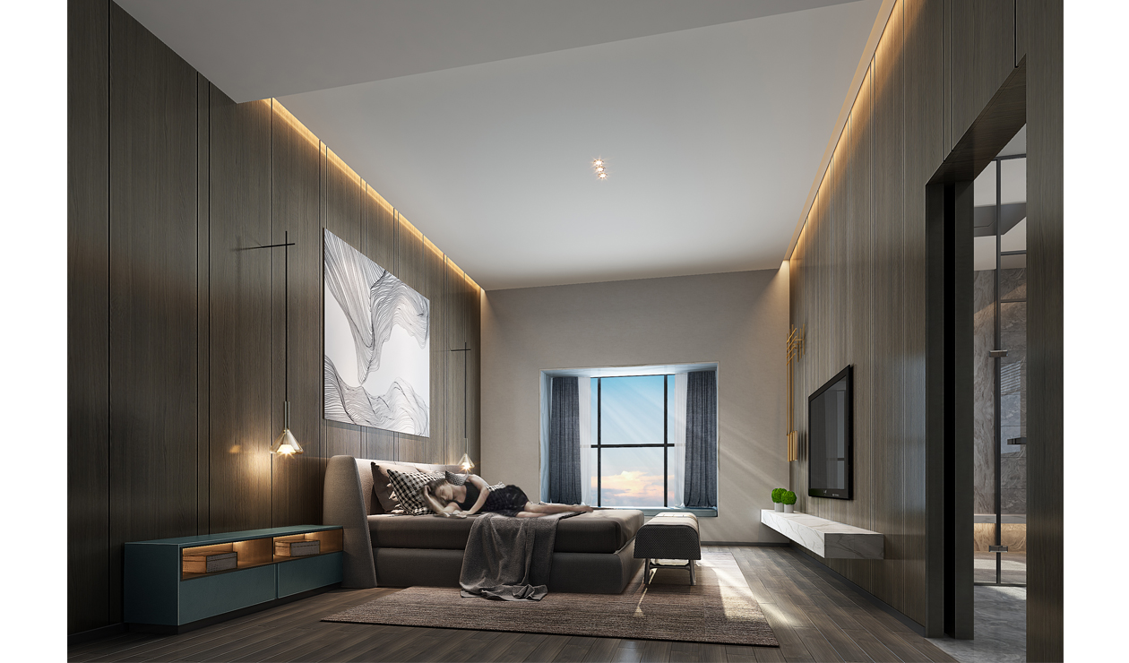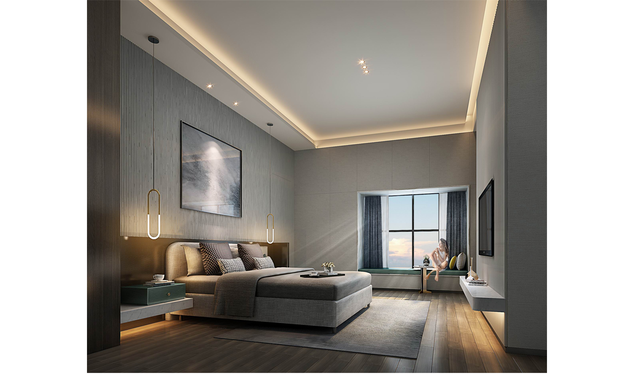 客厅里简洁的天花,一套沙发,一个茶几,一个电视柜,加入超现实主义的框画,金属感吊灯等简单的元素,完美的诠释了现代风格的表现手法。该卧室以素雅的色彩,简练的线条,富有质感的材质,营造出空间的层次感。渗入稳重高雅的色调,温馨却不失格调。