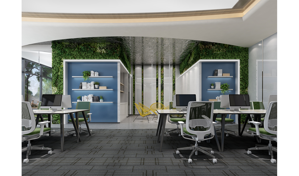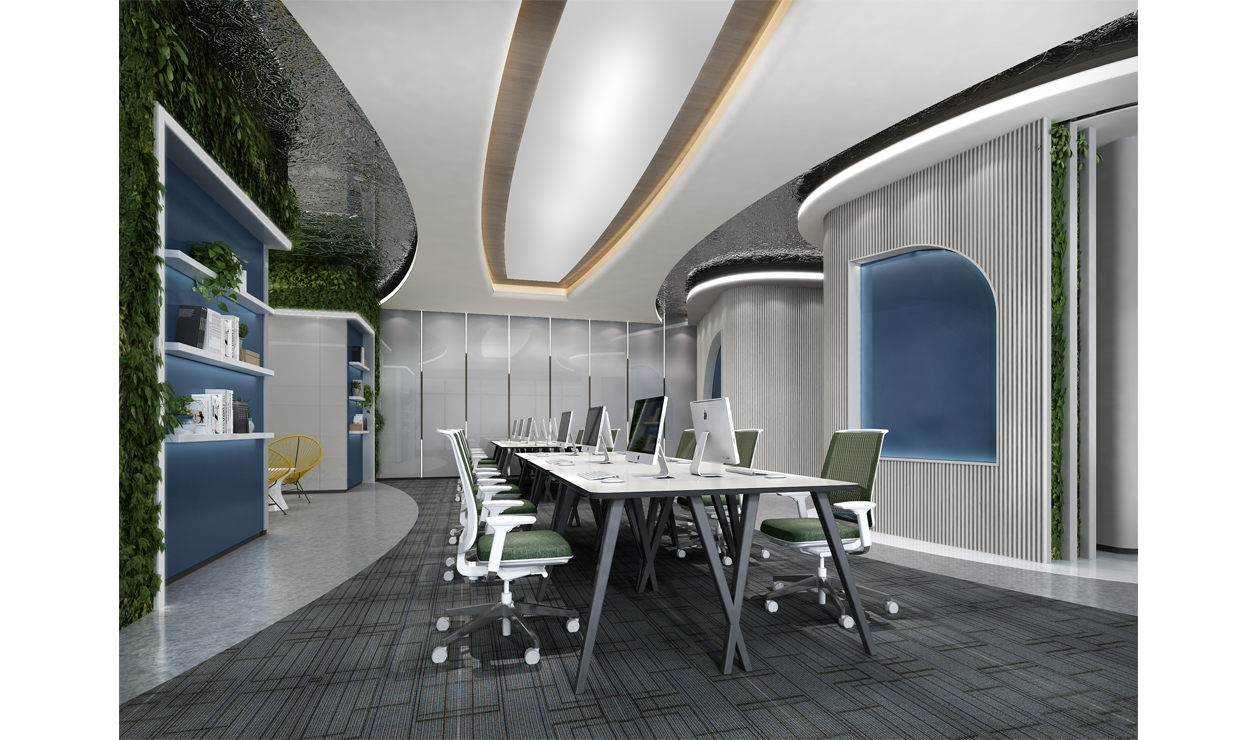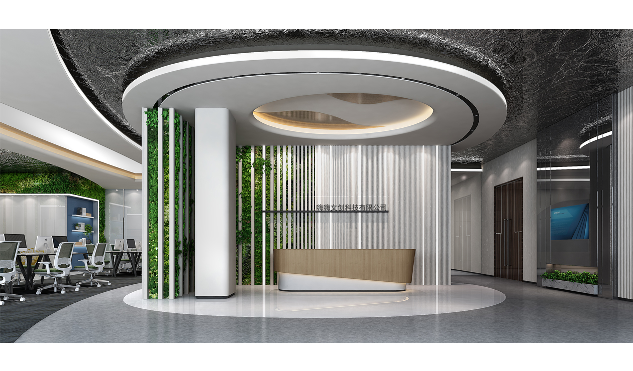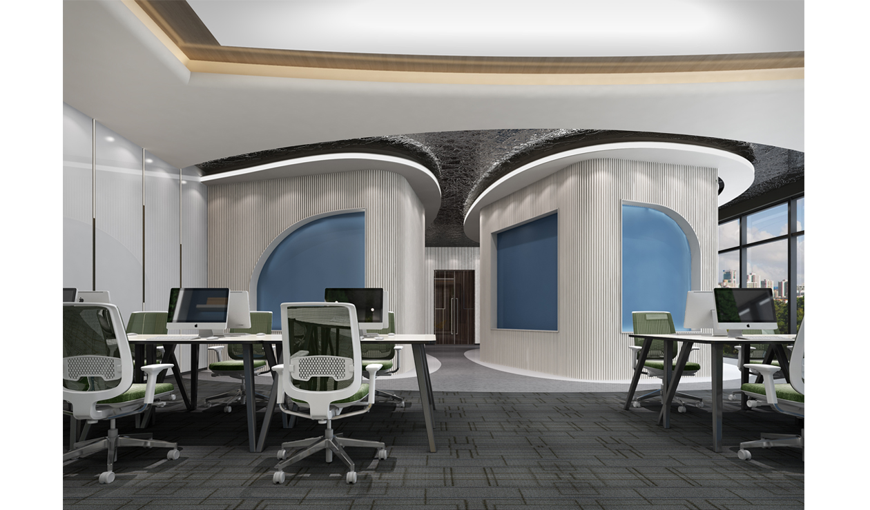 科技神奇在于折腾,但却源于对自然的亲近。怡心自然探索激发员工创造力,办公室设计呈现贯穿全场的开放性,前台顶面水波纹的流动,无尽的纵深感与立面的渐变感带来的通透性。在回望与重塑圆形吊顶,你可领悟时光曾缓慢而轻盈游走姿态。灵动感让你选择忘却繁杂的存在,专注一个个当下。